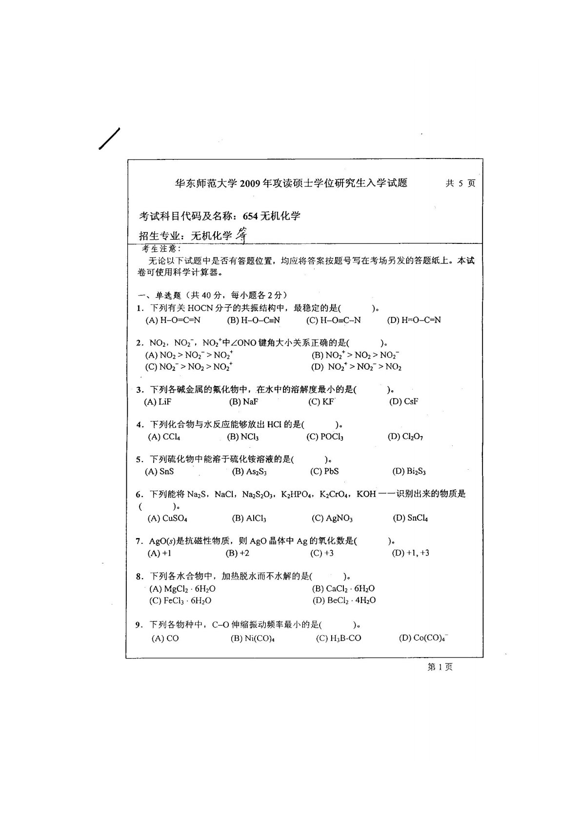 华东师范大学640普通化学原理一2009年真题