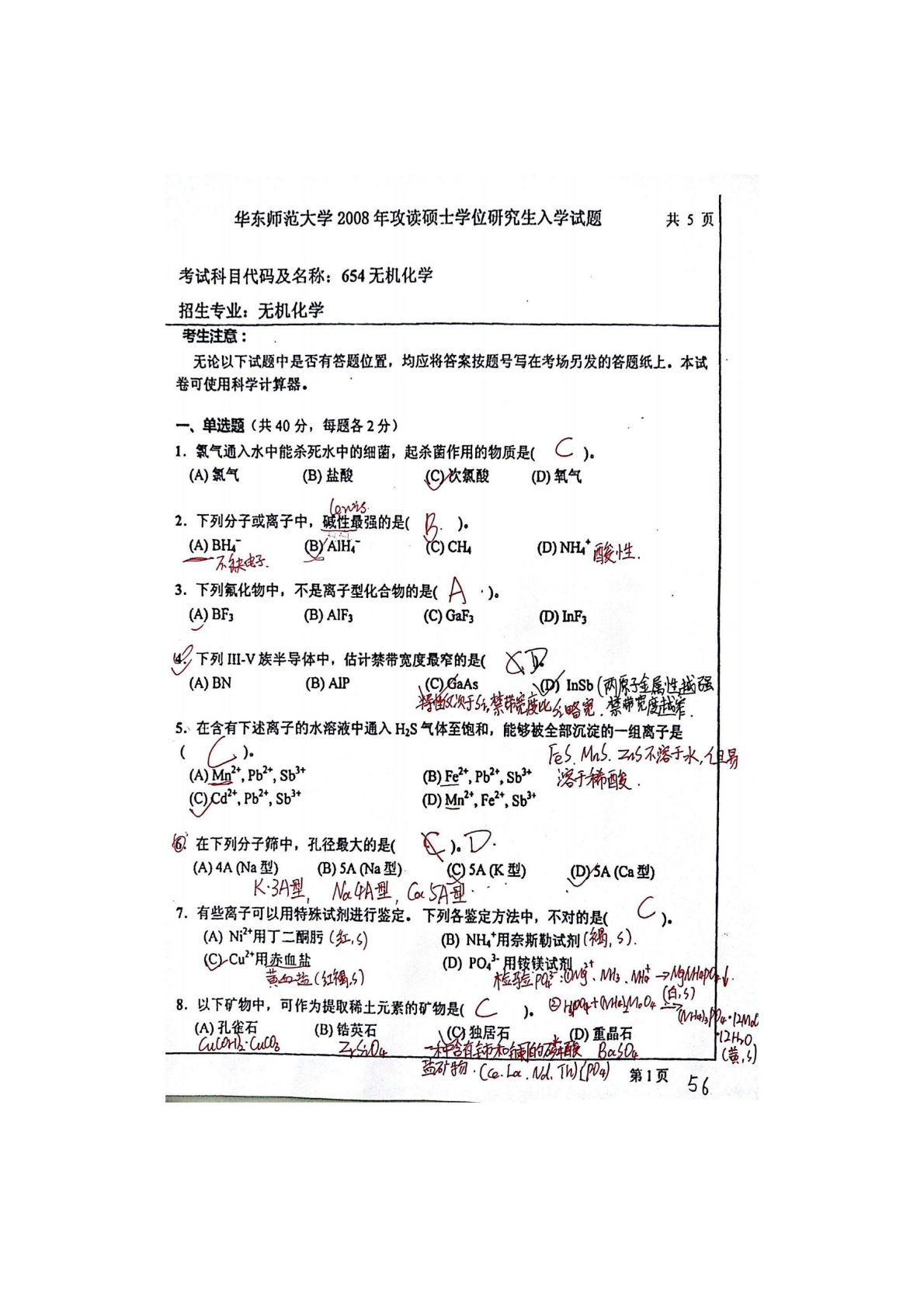 华东师范大学640普通化学原理一2008年真题答案(无机化学)(手写版)