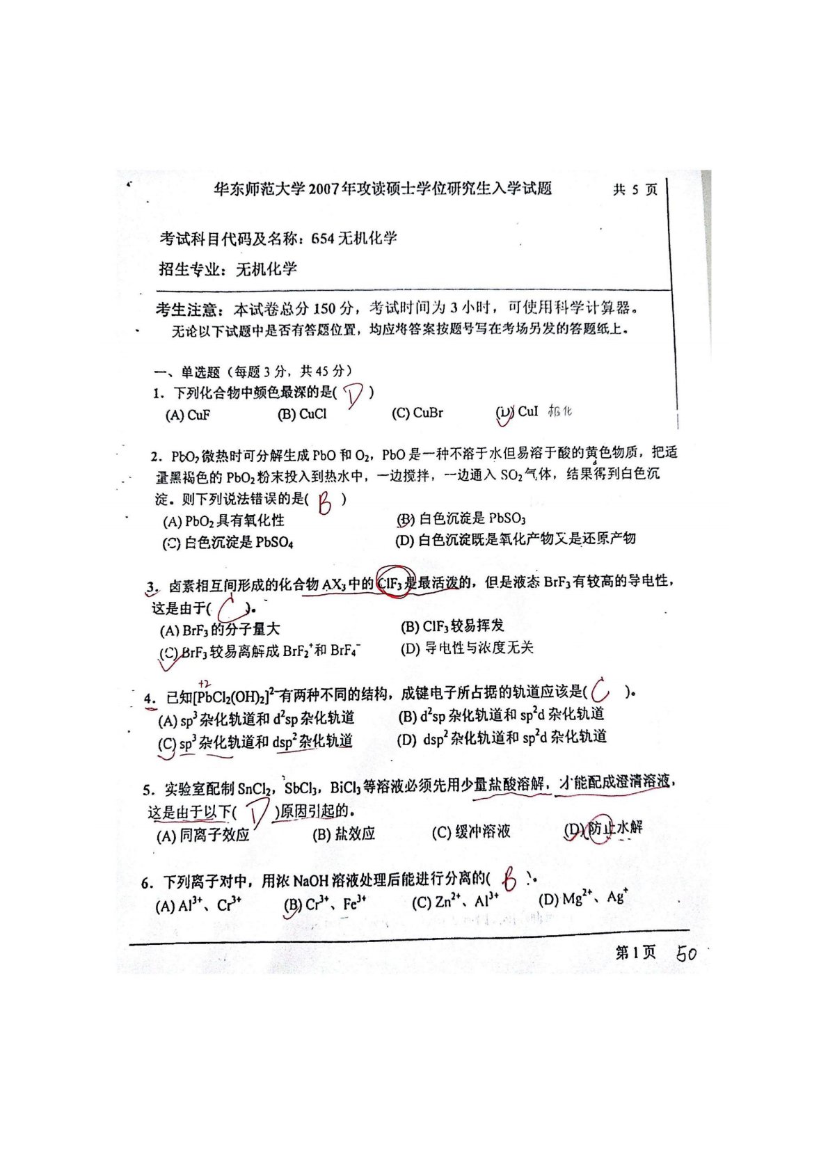 华东师范大学640普通化学原理一2007年真题答案(无机化学)(手写版)