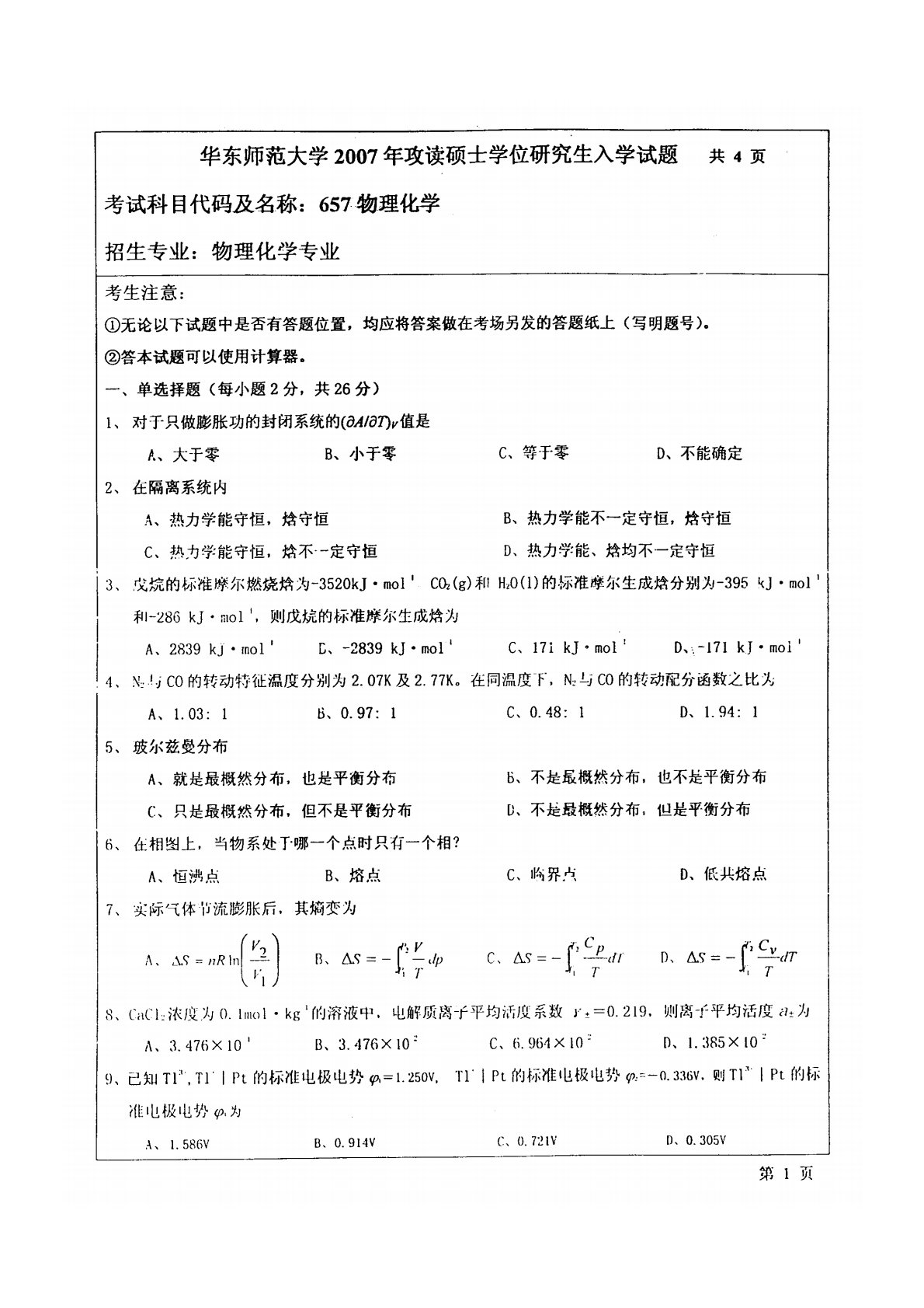 华东师范大学640普通化学原理一2007年真题(物理化学)