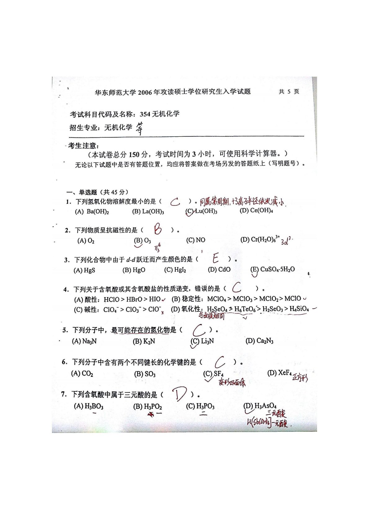华东师范大学640普通化学原理一2006年真题答案(无机化学)(手写版)