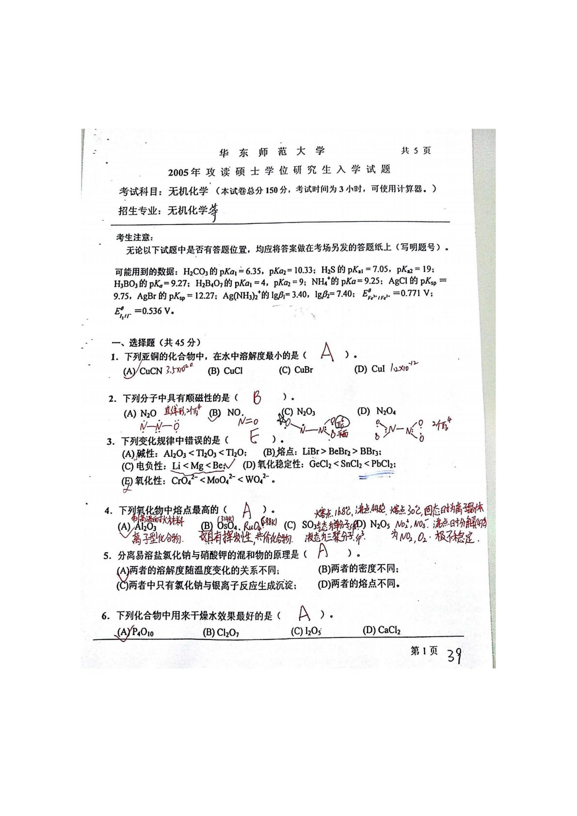 华东师范大学640普通化学原理一2005年真题答案(无机化学)(手写版)