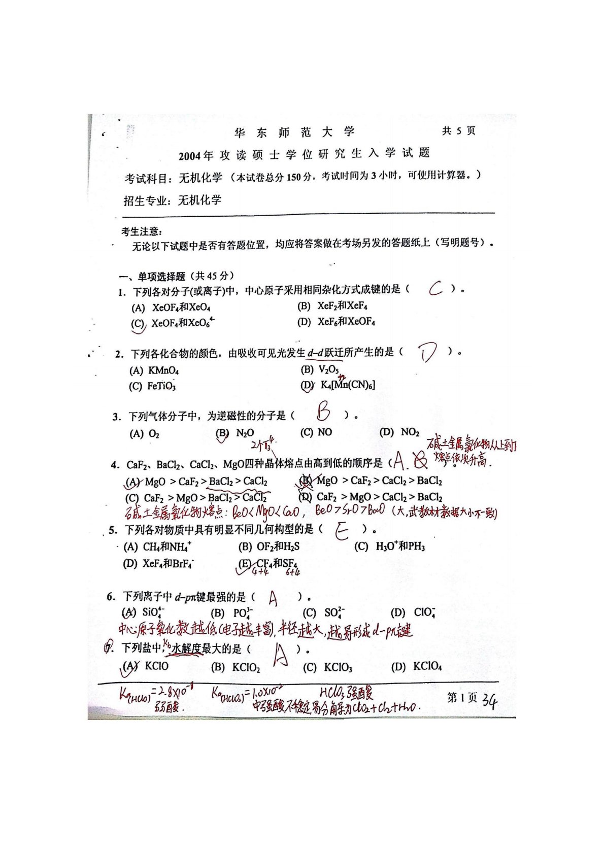 华东师范大学640普通化学原理一2004年真题答案(无机化学)(手写版)
