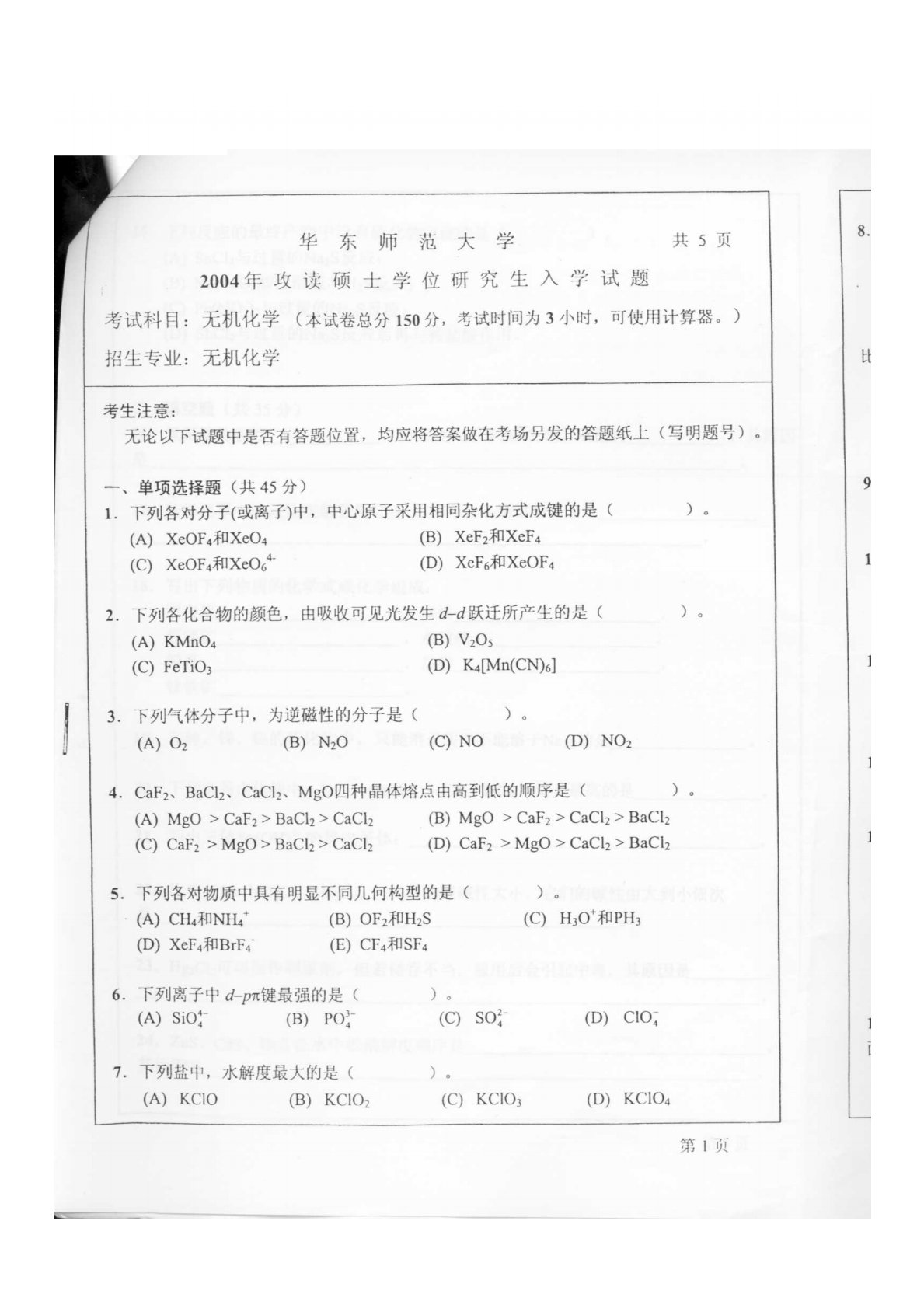 华东师范大学640普通化学原理一2004年真题