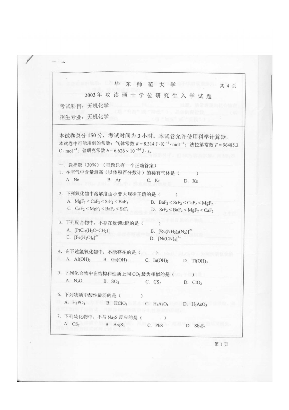 华东师范大学640普通化学原理一2003年真题
