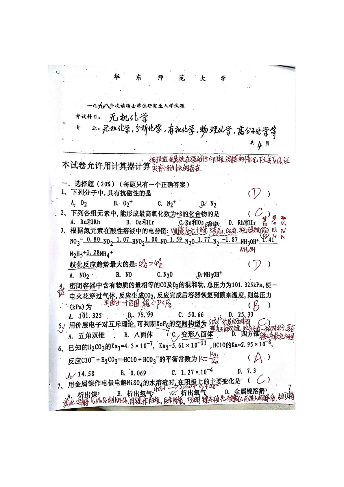 华东师范大学640普通化学原理一1998年真题答案(无机化学)(手写版)