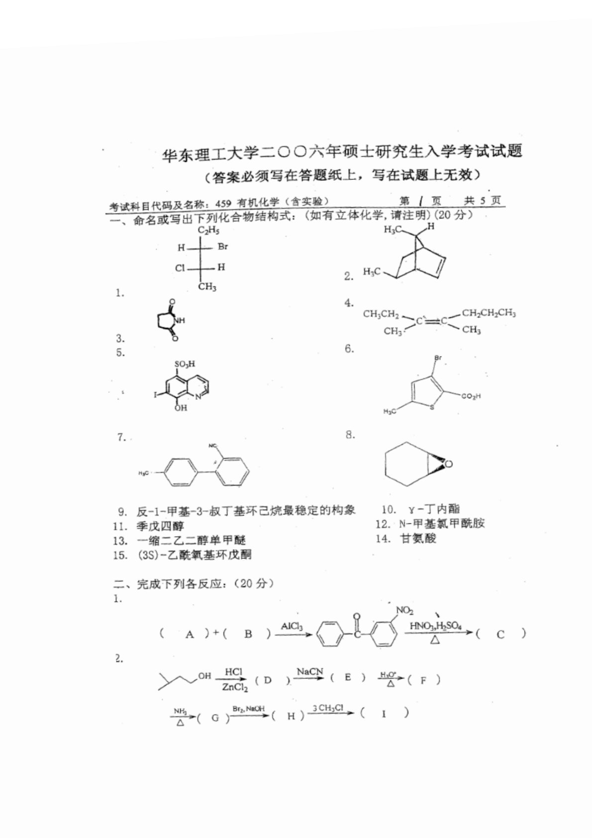 华东理工大学803有机化学2006年真题