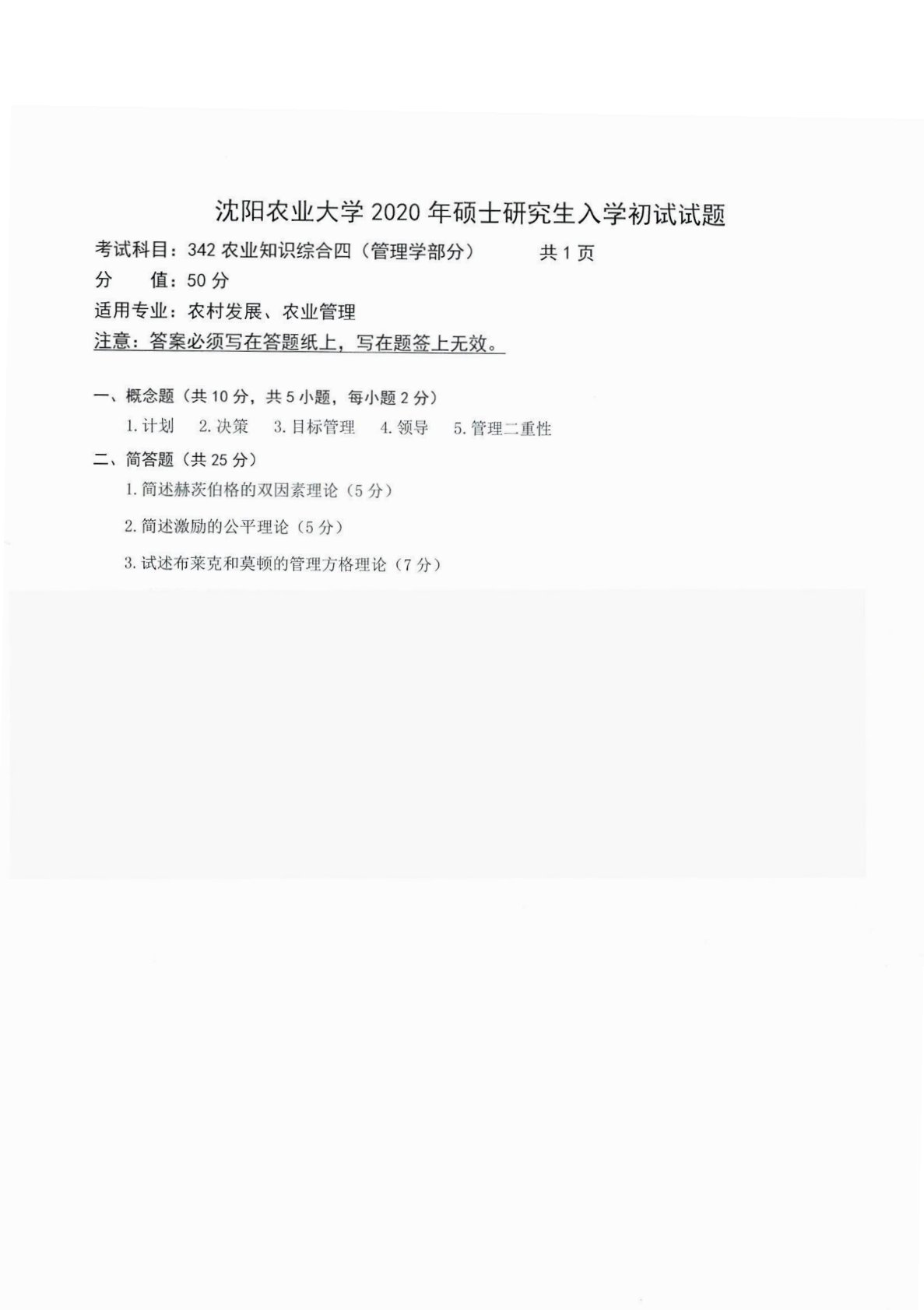 沈阳农业大学342农业知识综合四2020年真题
