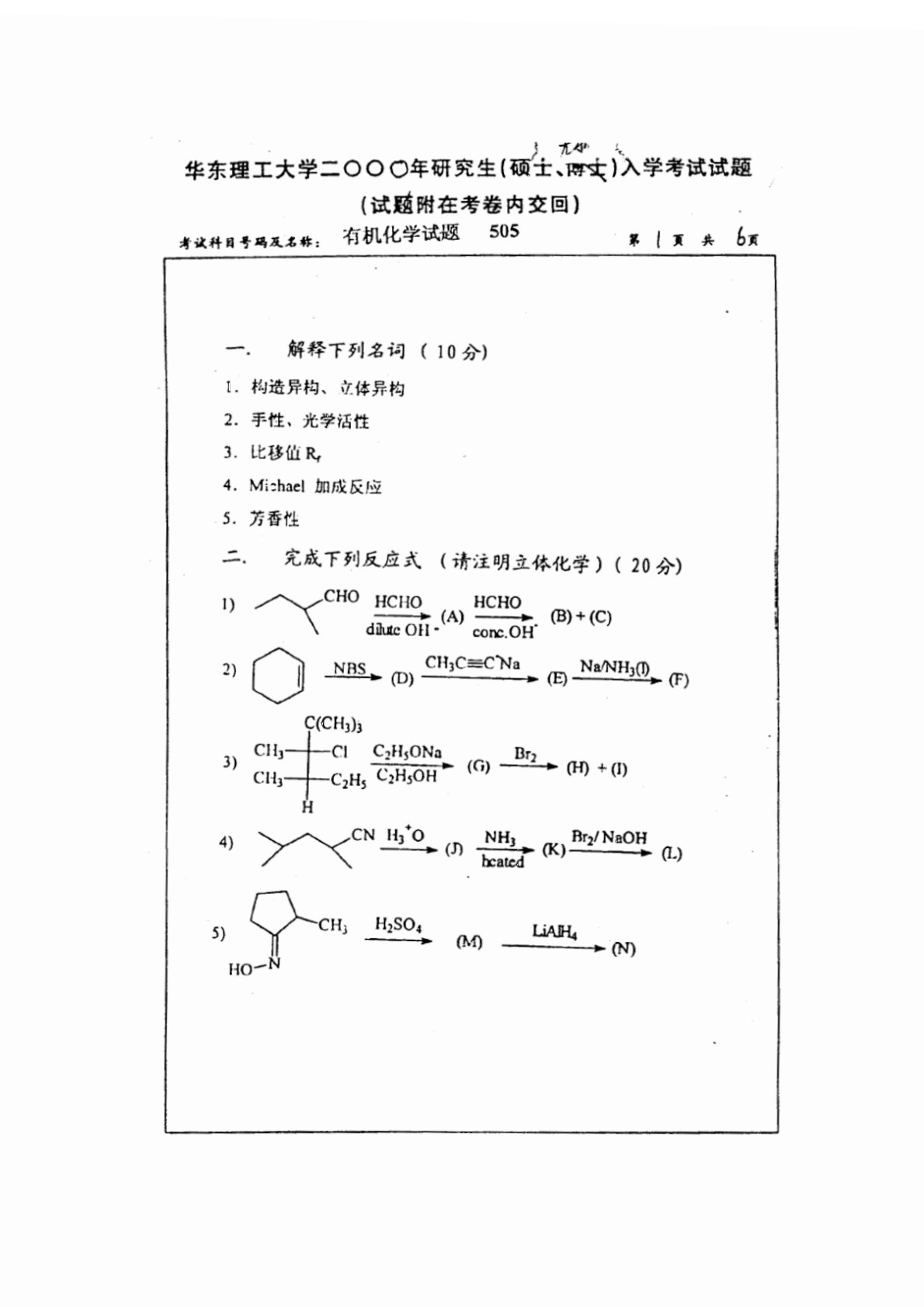 华东理工大学803有机化学2000年真题