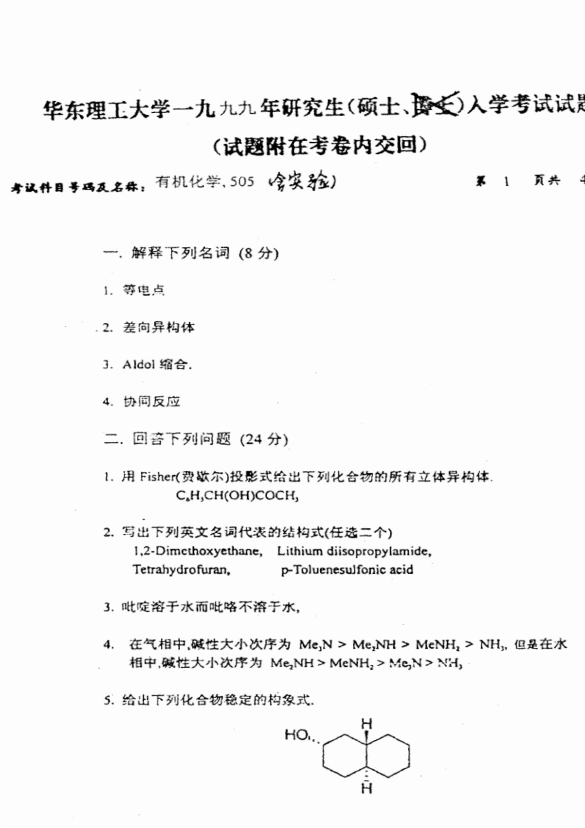 华东理工大学803有机化学1999年真题