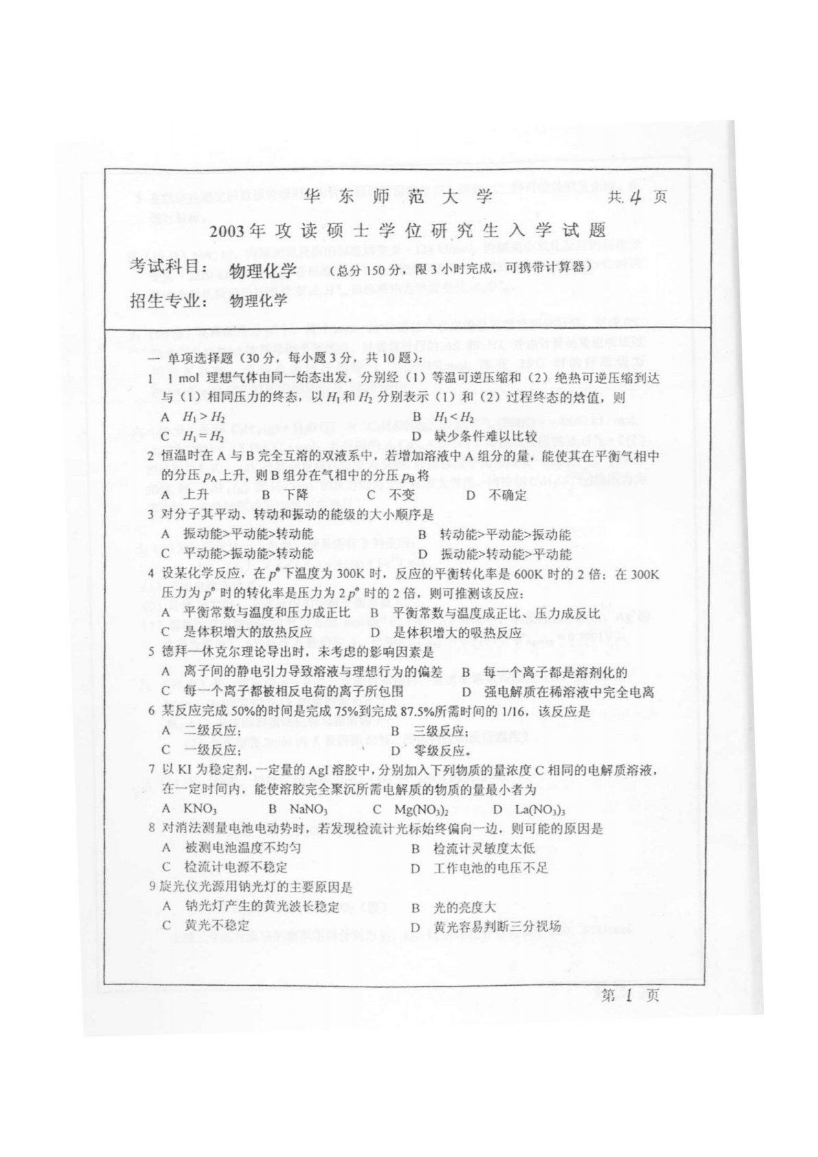 华东师范大学640普通化学原理一2003年真题(物理化学)