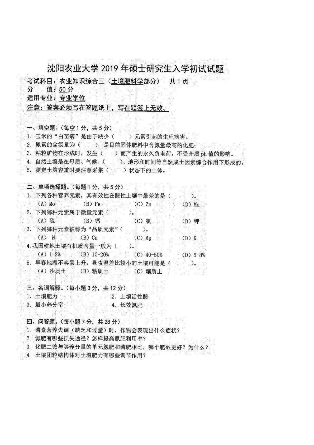 沈阳农业大学341农业知识综合三2019年真题