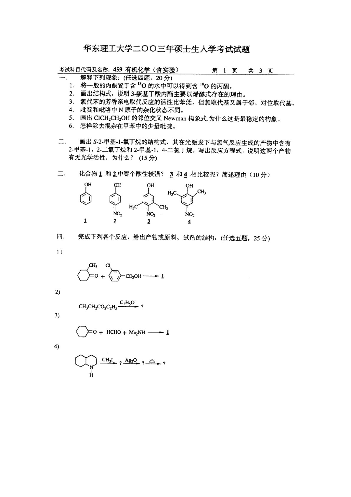 华东理工大学803有机化学2003年真题