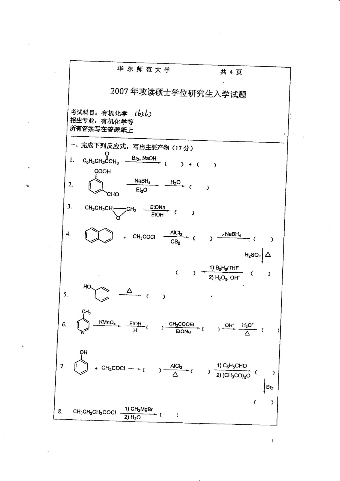 华东师范大学640普通化学原理一2007年真题(有机化学)