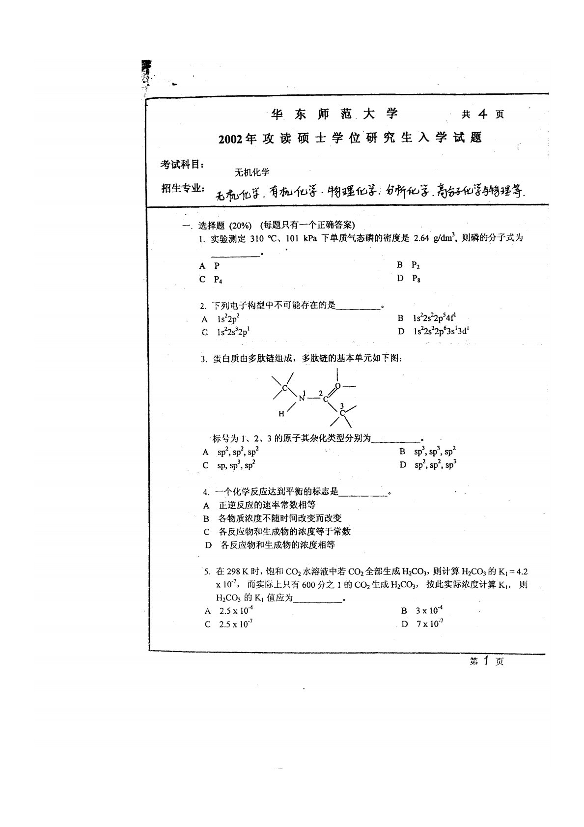 华东师范大学640普通化学原理一2002年真题