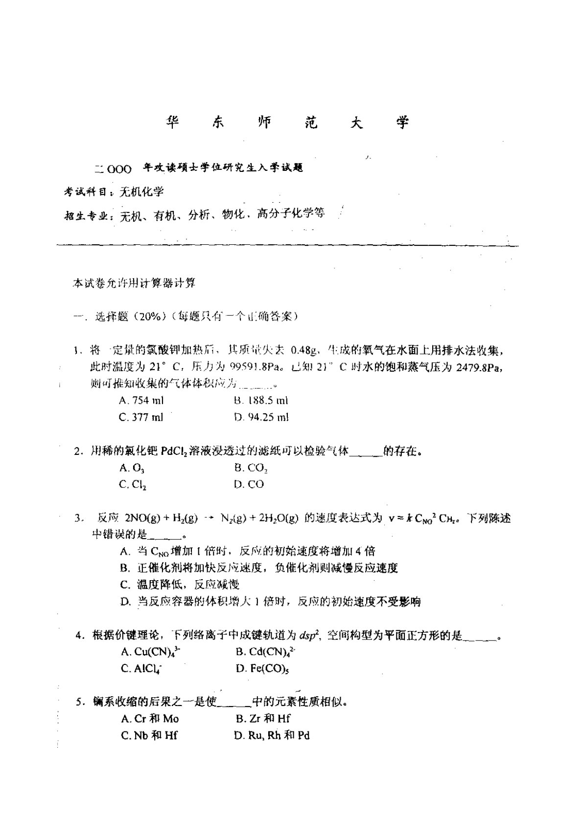 华东师范大学640普通化学原理一2000年真题