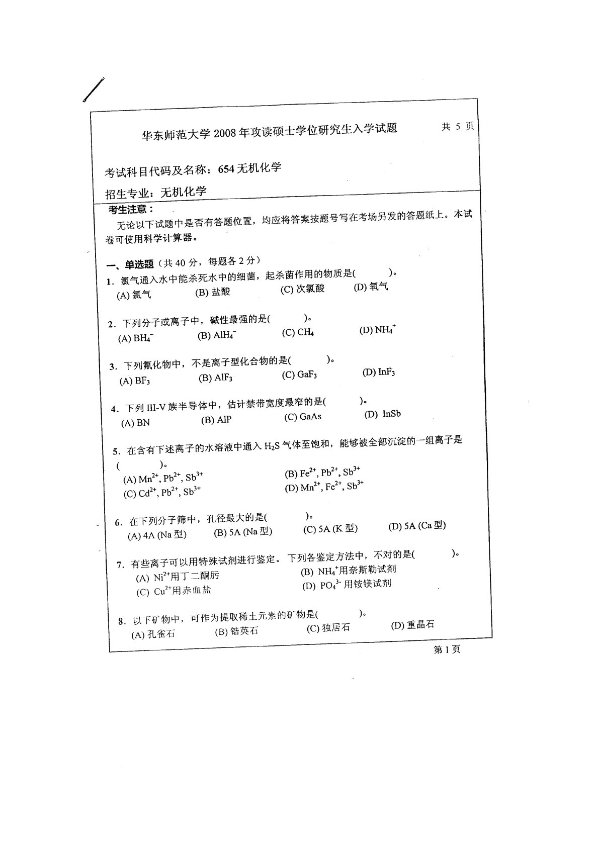 华东师范大学640普通化学原理一2008年真题