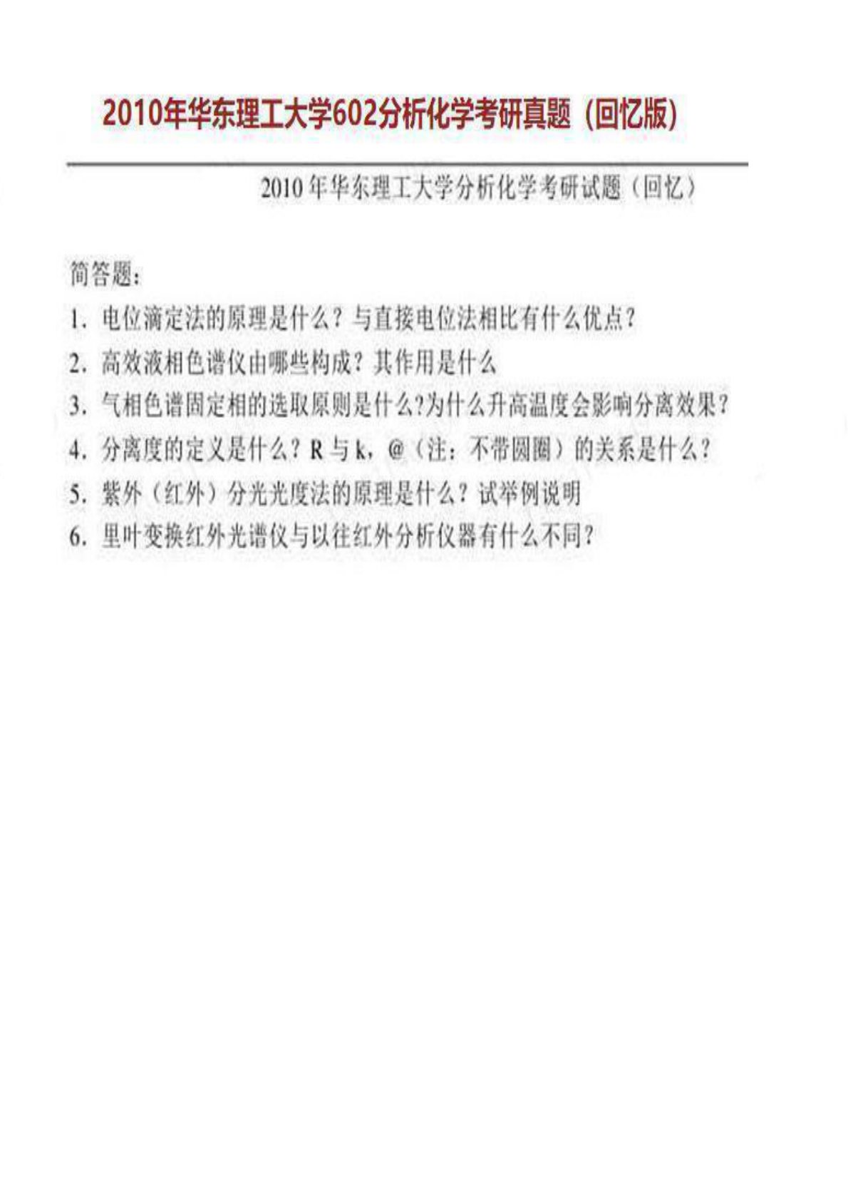 华东理工大学602分析化学2010年真题