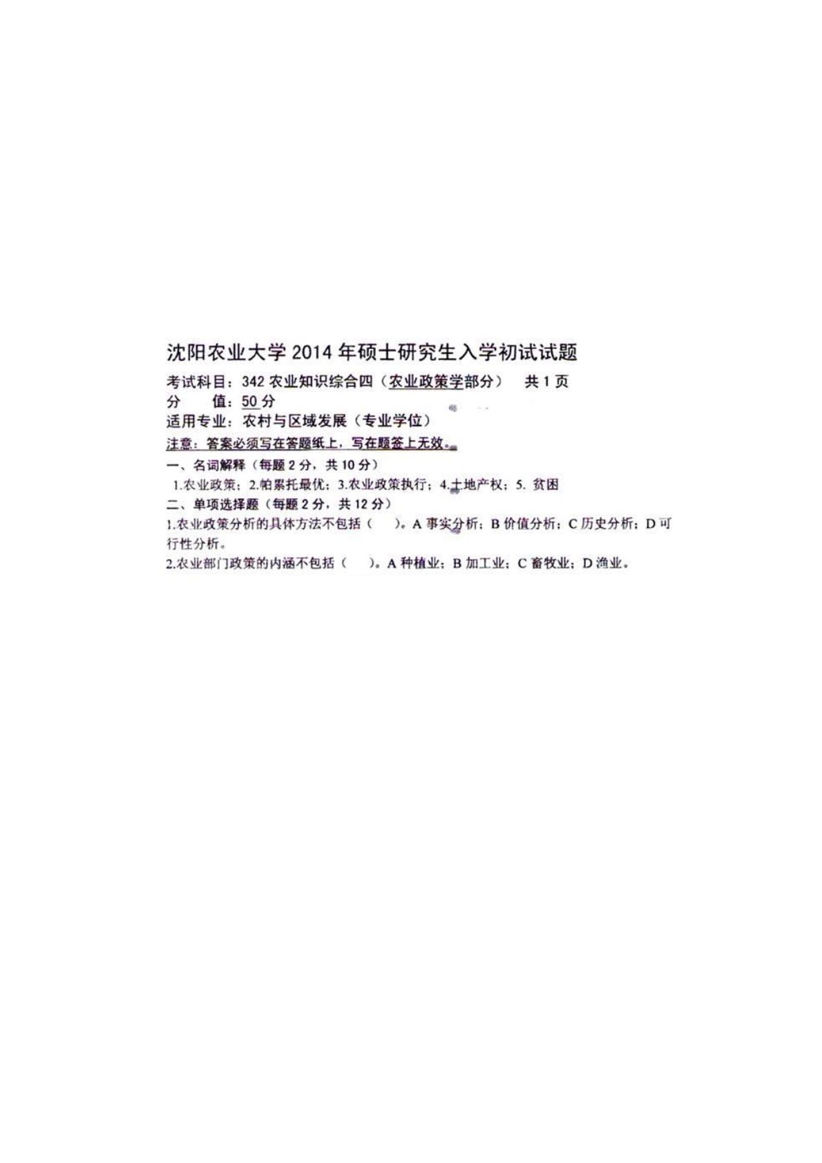 沈阳农业大学342农业知识综合四2014年真题