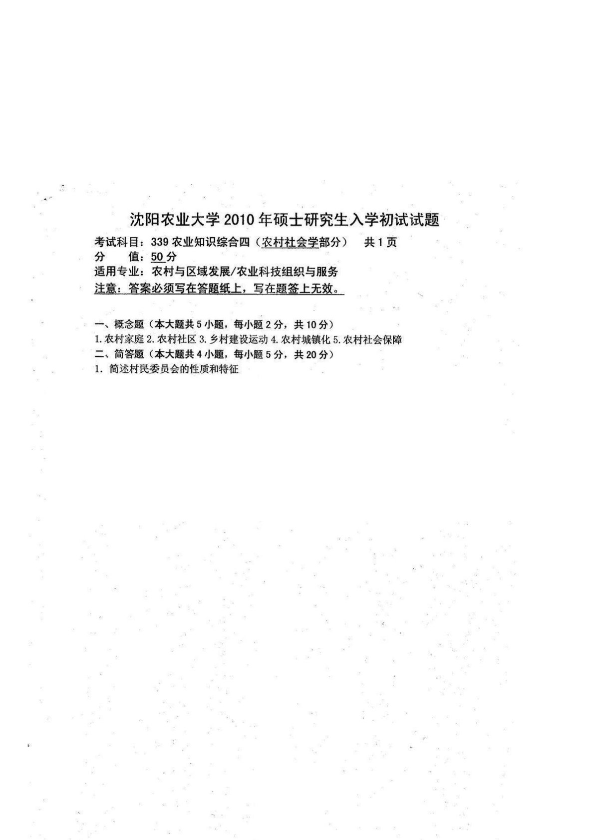 沈阳农业大学342农业知识综合四2010年真题
