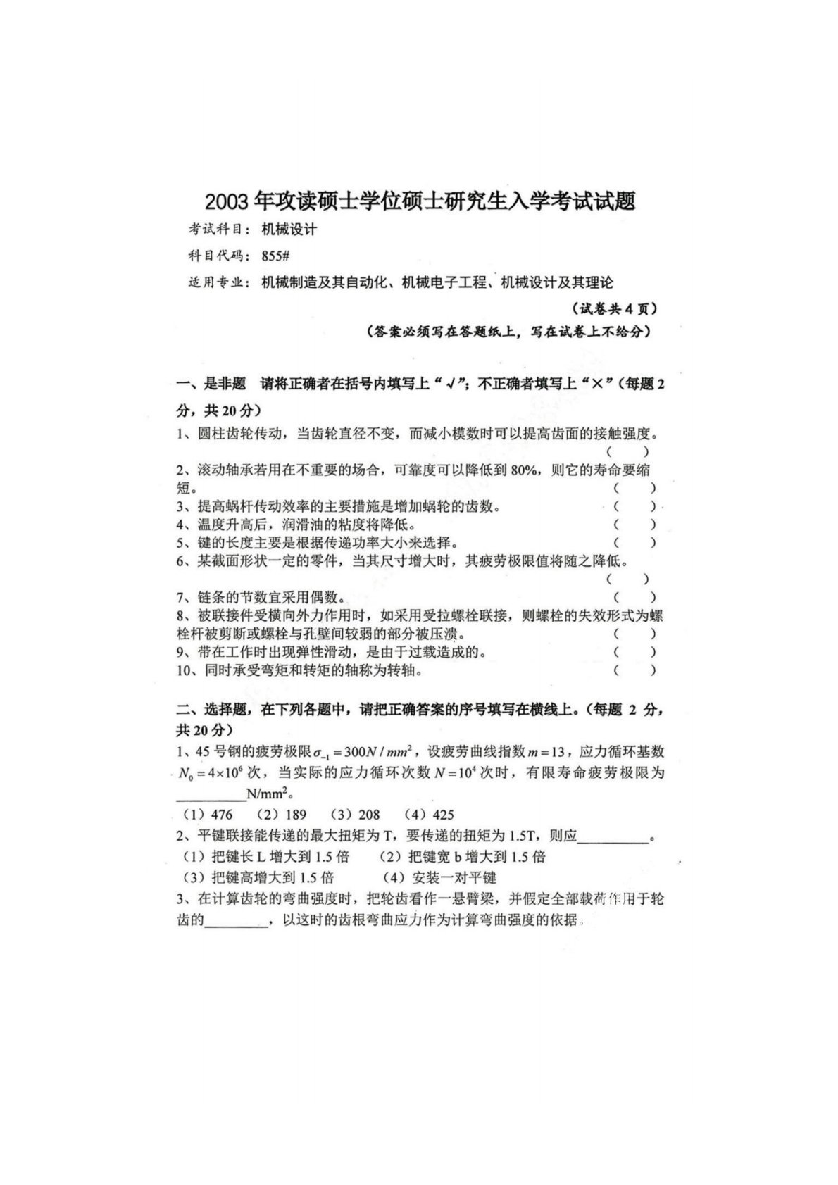 四川大学855机械设计2003年真题