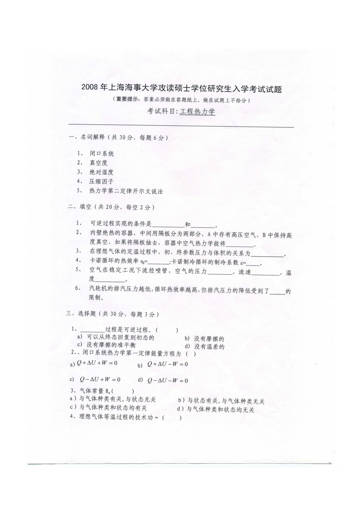 上海海事大学803工程热力学2008年真题