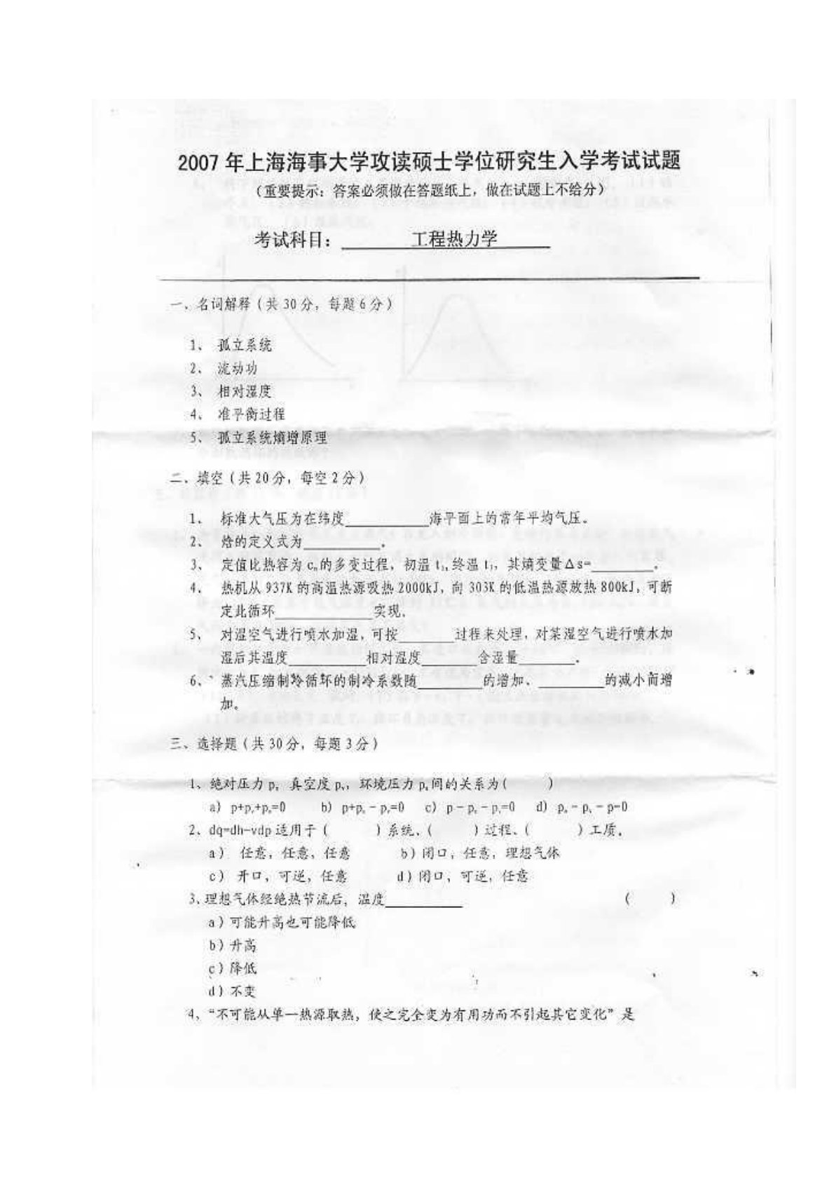 上海海事大学803工程热力学2007年真题
