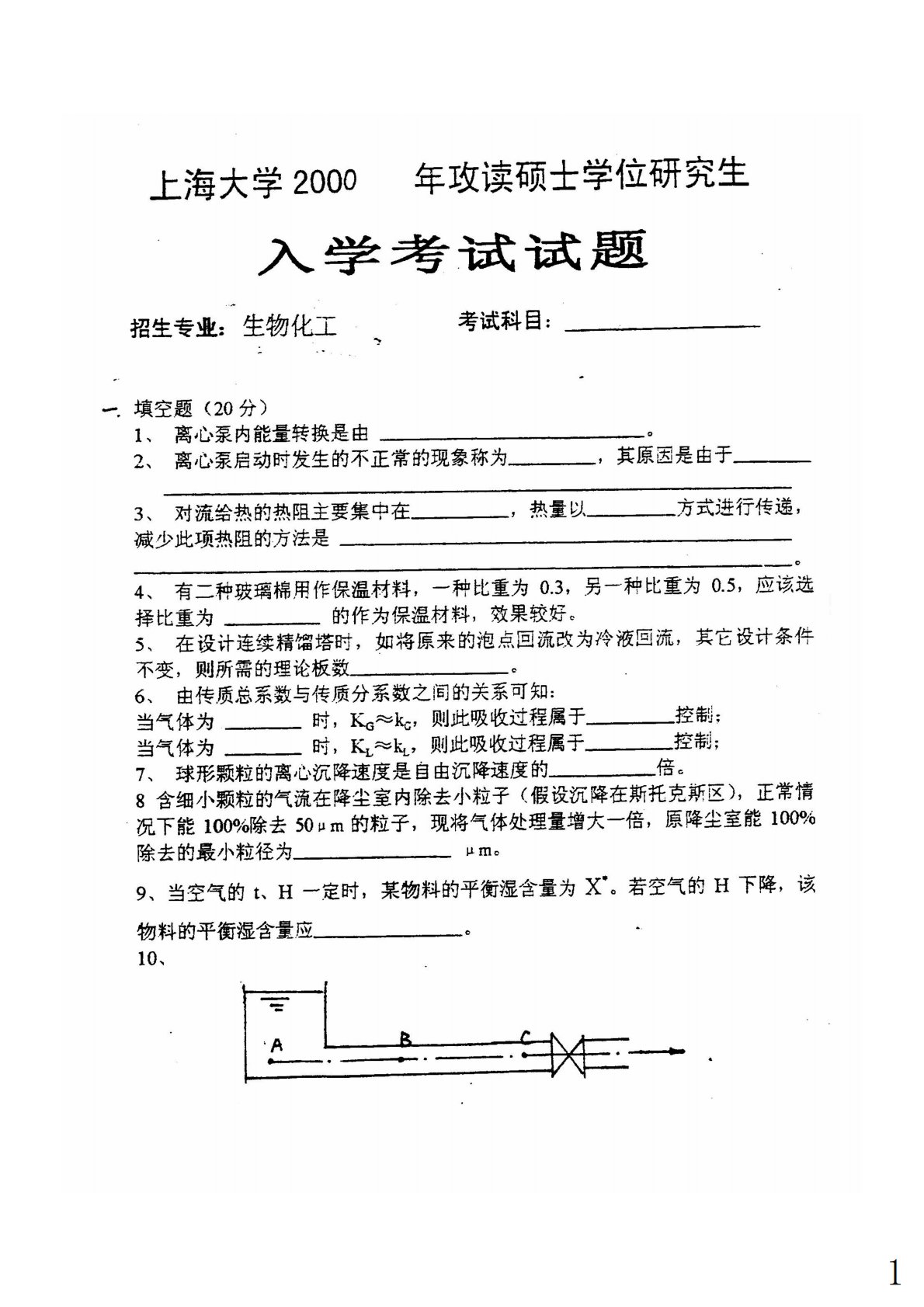 上海大学852化工原理2000年真题