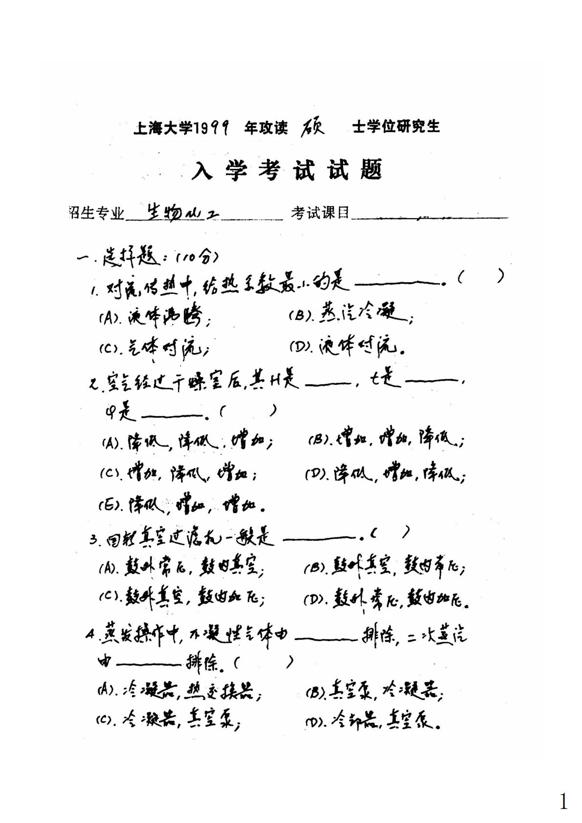 上海大学852化工原理1999年真题手写版