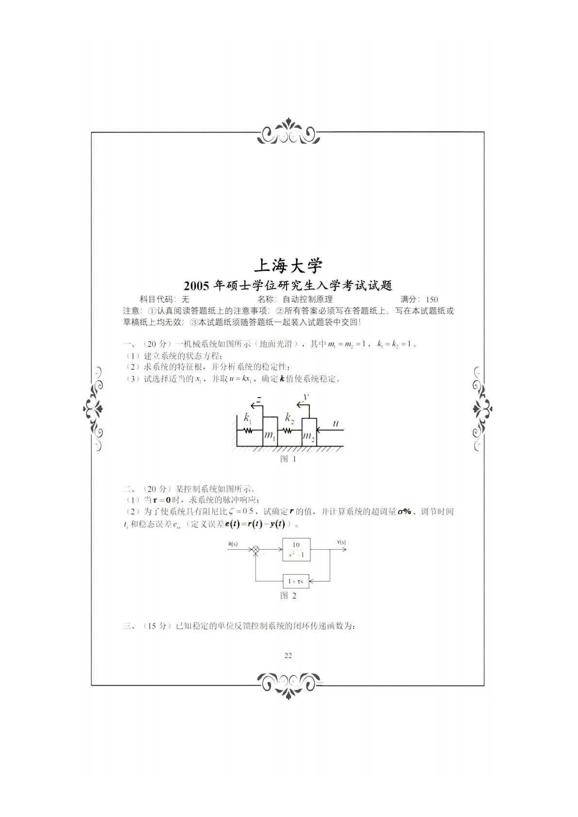 上海大学836自动控制理论(含经典和现代)(学硕)2005年真题