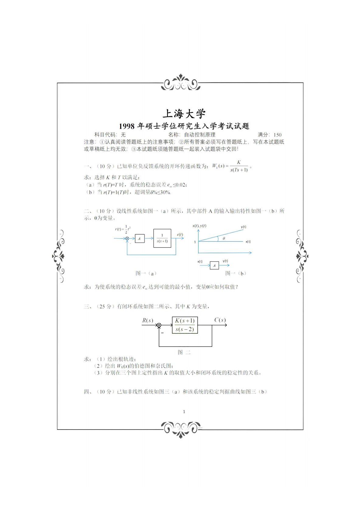 上海大学836自动控制理论(含经典和现代)(学硕)1998年真题