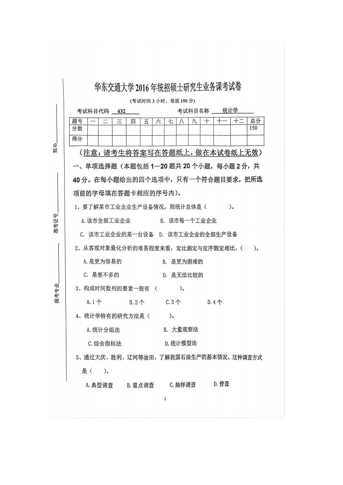 华东交通大学432统计学2016年真题