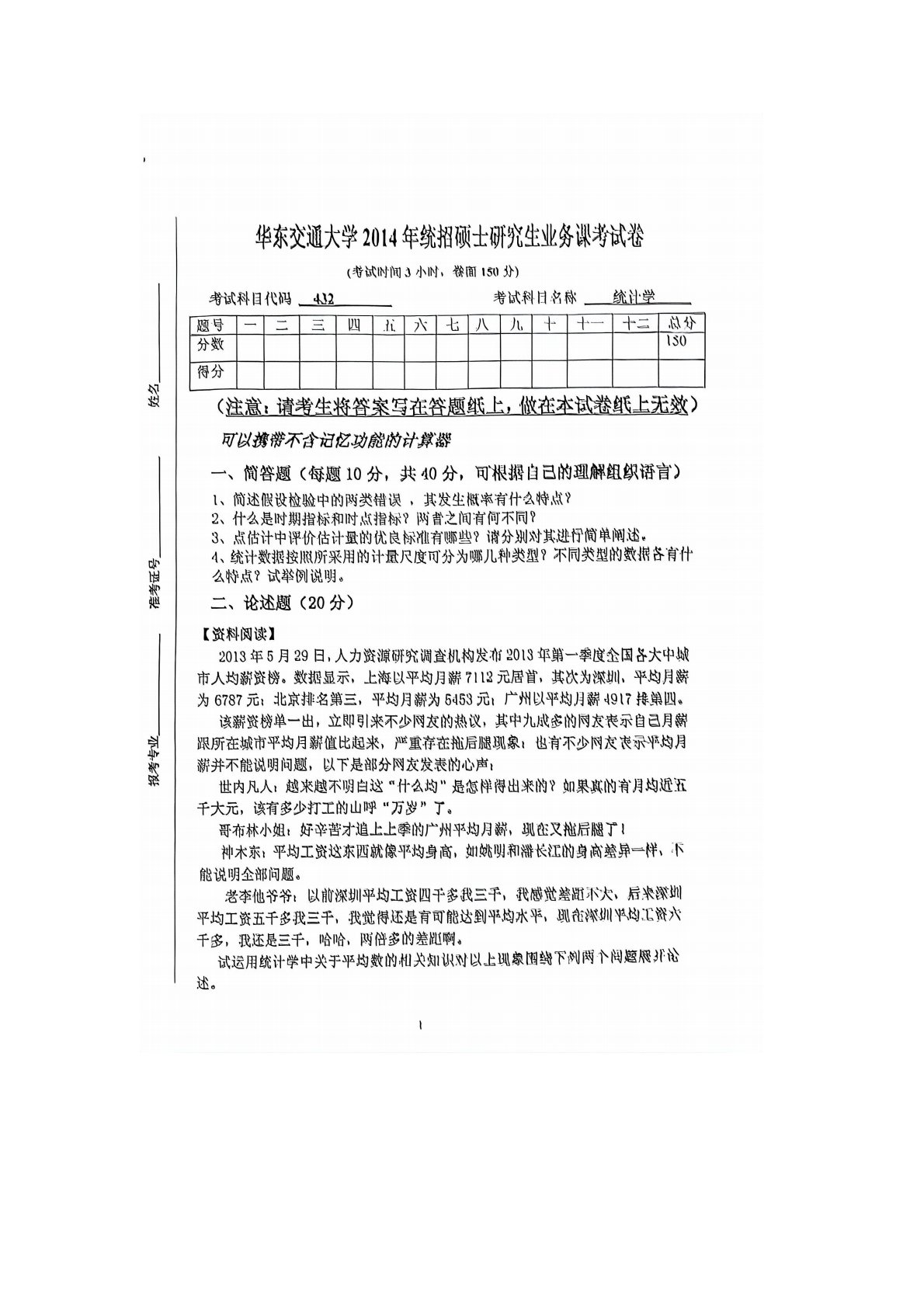华东交通大学432统计学2014年真题