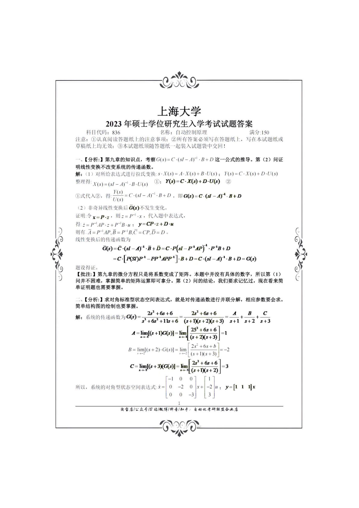 上海大学836自动控制理论(含经典和现代)(学硕)2023年真题答案