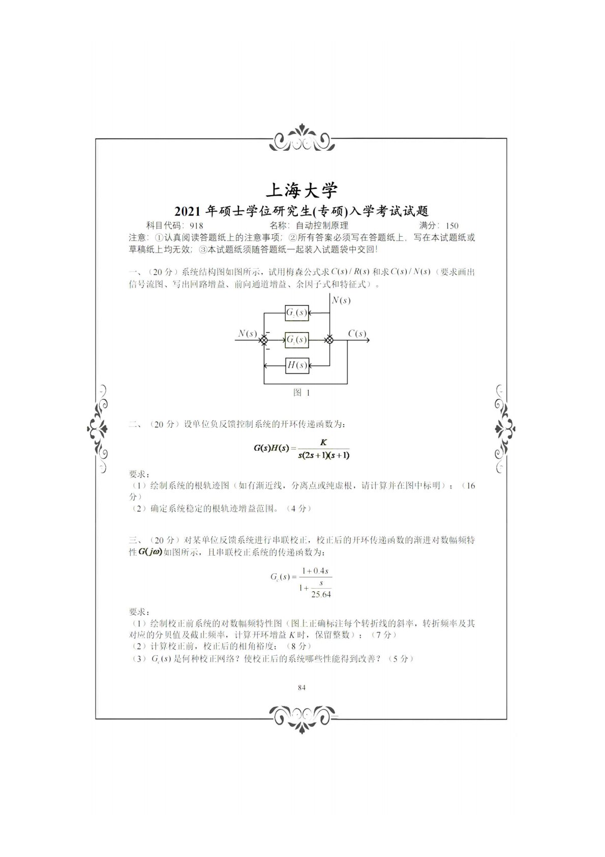上海大学915自动控制理论(含经典和现代)(专硕)2021年真题