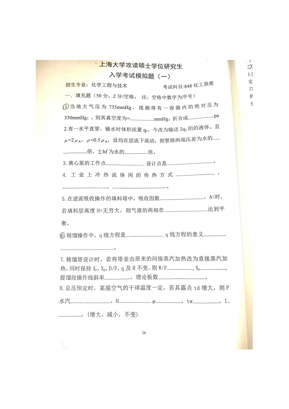 上海大学852化工原理模拟题