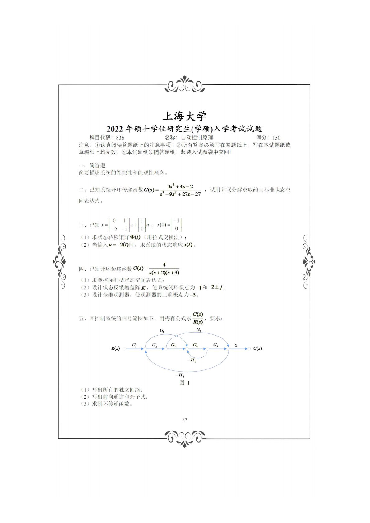上海大学836自动控制理论(含经典和现代)(学硕)2022年真题