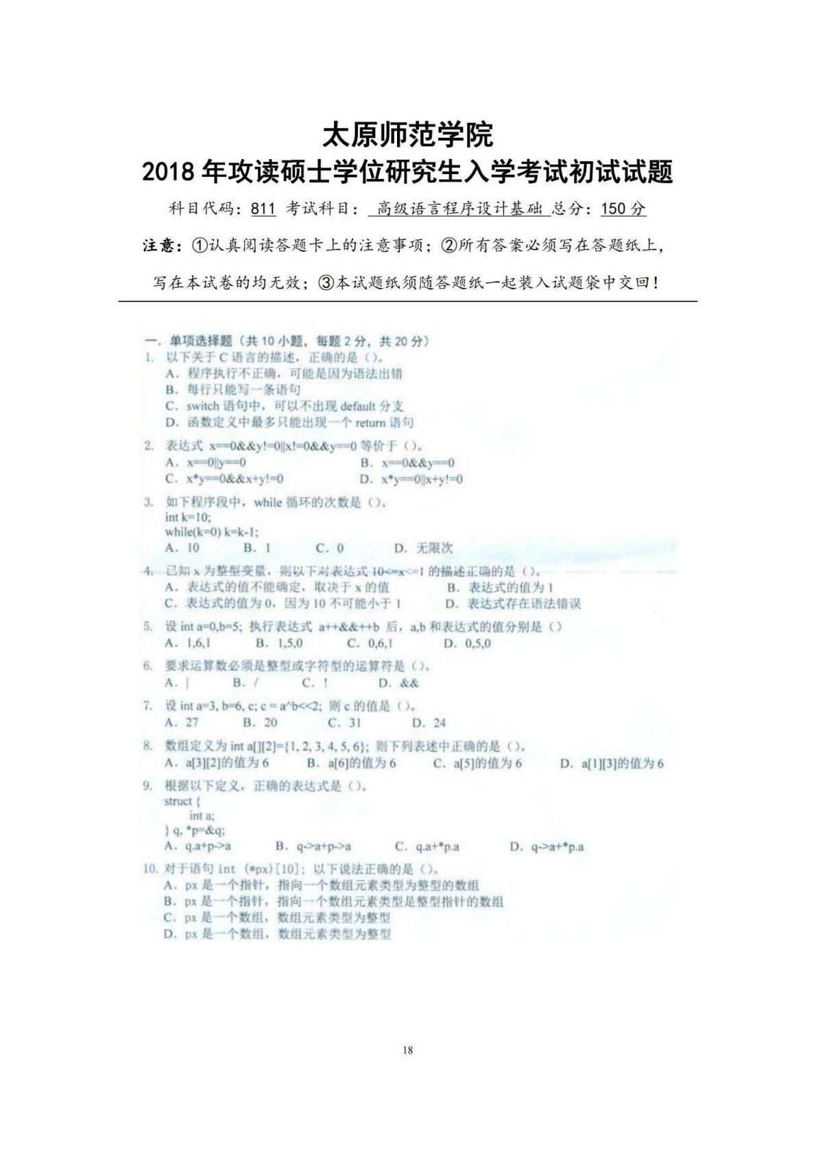 太原师范学院811数据结构与算法(C语言)2018年真题