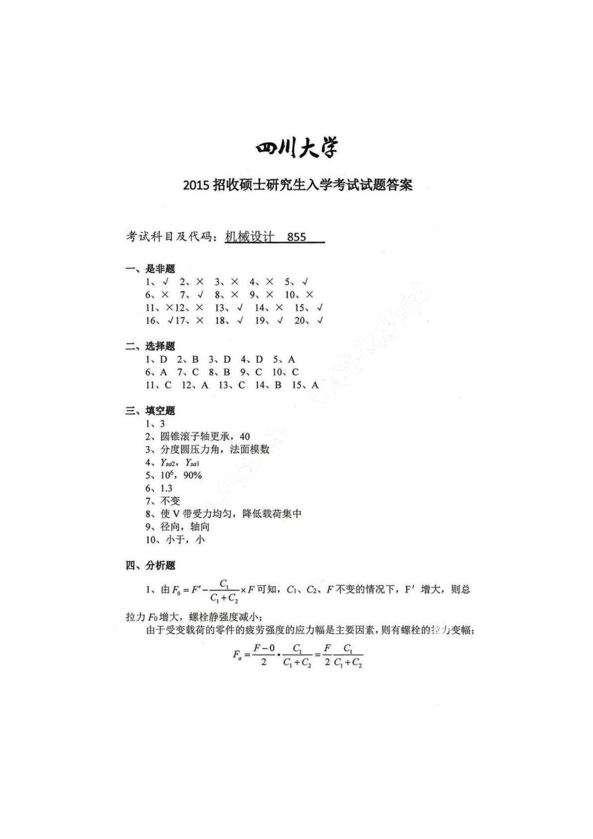 四川大学855机械设计2015年真题答案