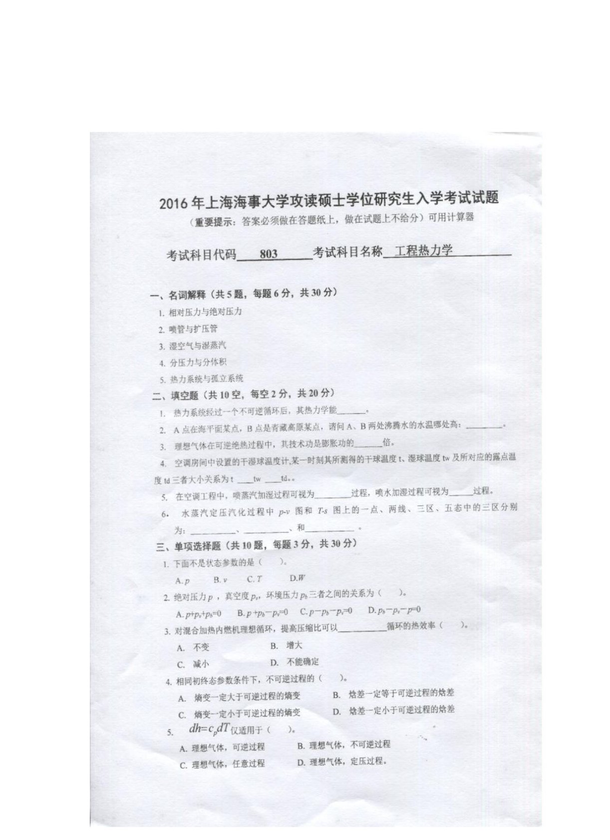 上海海事大学803工程热力学2016年真题