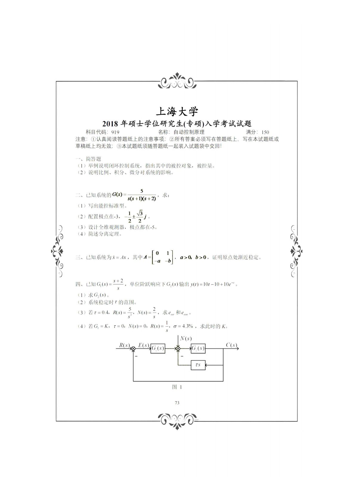 上海大学915自动控制理论(含经典和现代)(专硕)2018年真题