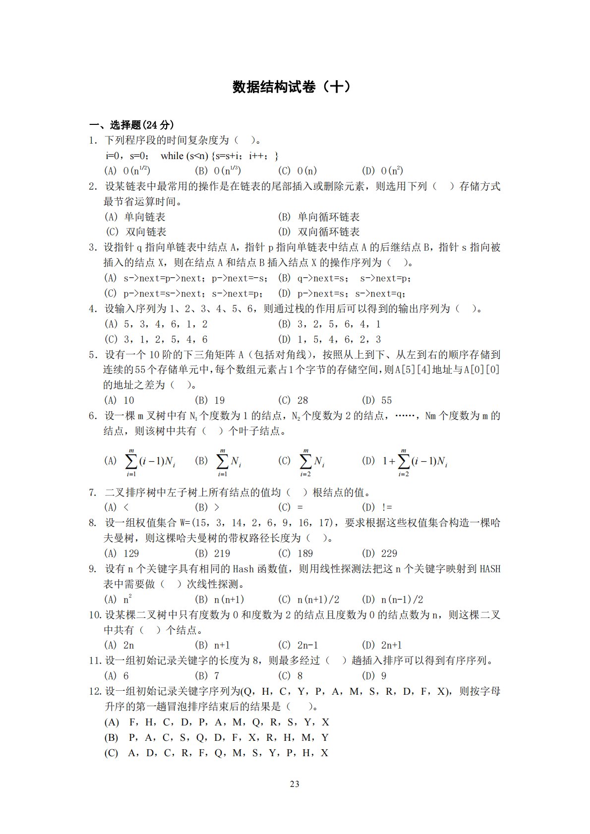 23数据结构试卷(十)一、选择题(24分)1.下列程序段的时间复杂度为()。i=0,s=0;while(snext=p->next;p->next=-s;(B)q->next=s;s->next=p;(C)p->next=s->next;s->next=p;(D)p->next=s;s->next=q;4.设输入序列为1、2、3、4、5、6,则通过栈的作用后可以得到的输出序列为()。(A)5,3,4,6,1,2(B)3,2,5,6,4,1(C)3,1,2,5,4,6(D)1,5,4,6,2,35.设有一个10阶的下三角矩阵A(包括对角线),按照从上到下、从左到右的顺序存储到连续的55个存储单元...