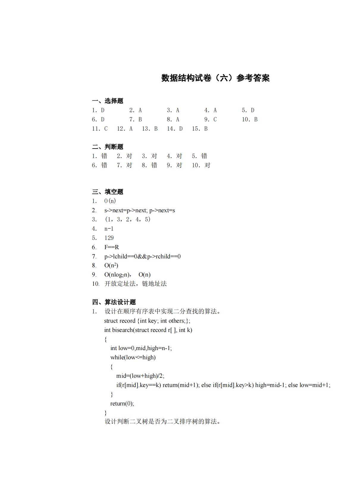 数据结构试卷(六)参考答案一、选择题1.D2.A3.A4.A5.D6.D7.B8.A9.C10.B11.C12.A13.B14.D15.B二、判断题1.错2.对3.对4.对5.错6.错7.对8.错9.对10.对}return(0);}mid=(low+high)/2;intlow=0,mid,high=n-1;while(lowlchild==0&&p->rchild==08.O(n2)9.O(nlog2n),O(n)10.三、填空题1.O(n)2.s->next=p->next;p->next=s3.(1,3,2,4,5)4.n-15.129开放定址法,链地址法四、算法设计题1.{{if(r...