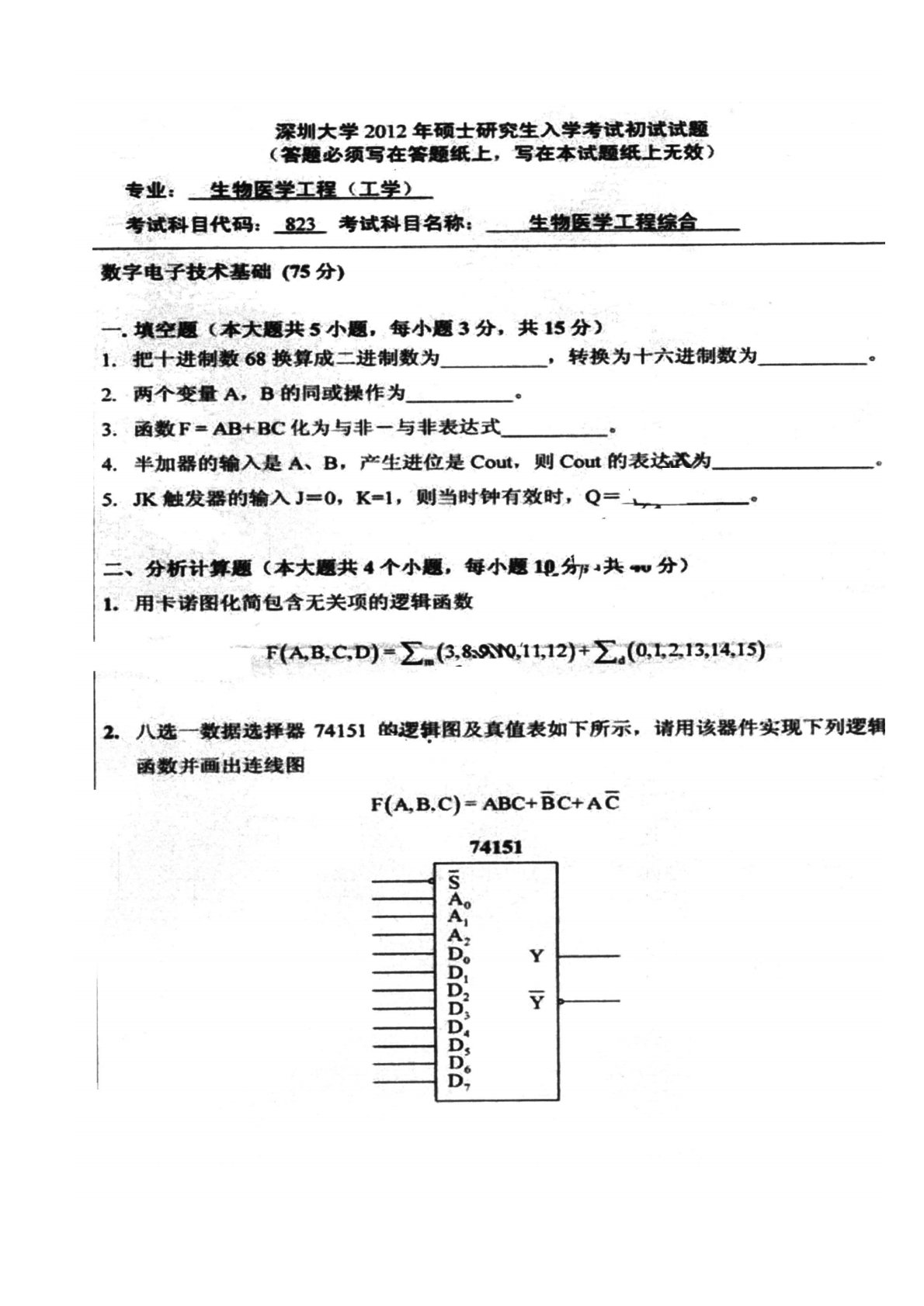 深圳大学910生物医学工程综合(数字电子技术基础部分)2012年真题
