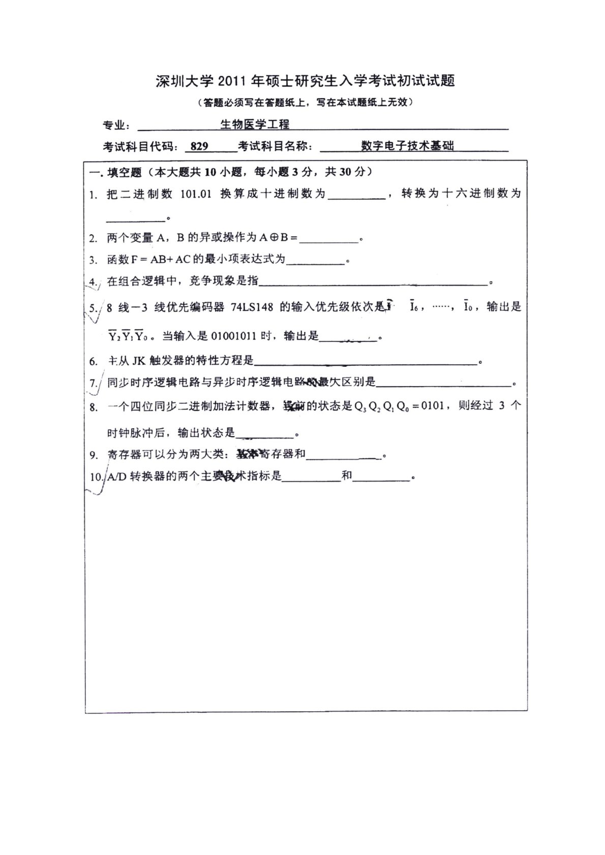 深圳大学910生物医学工程综合(数字电子技术基础部分)2011年真题