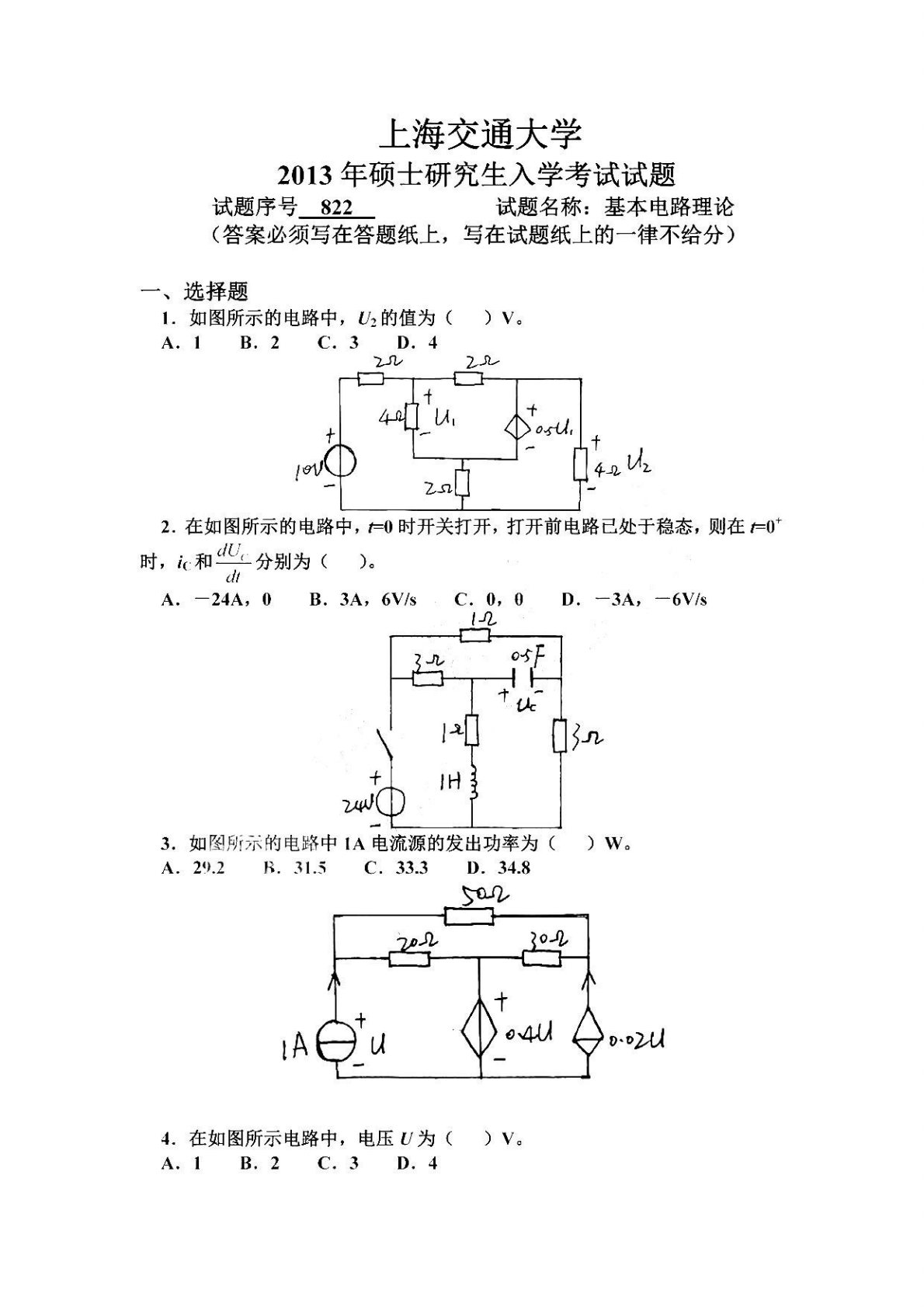 上海交通大学2013年822电路考研真题