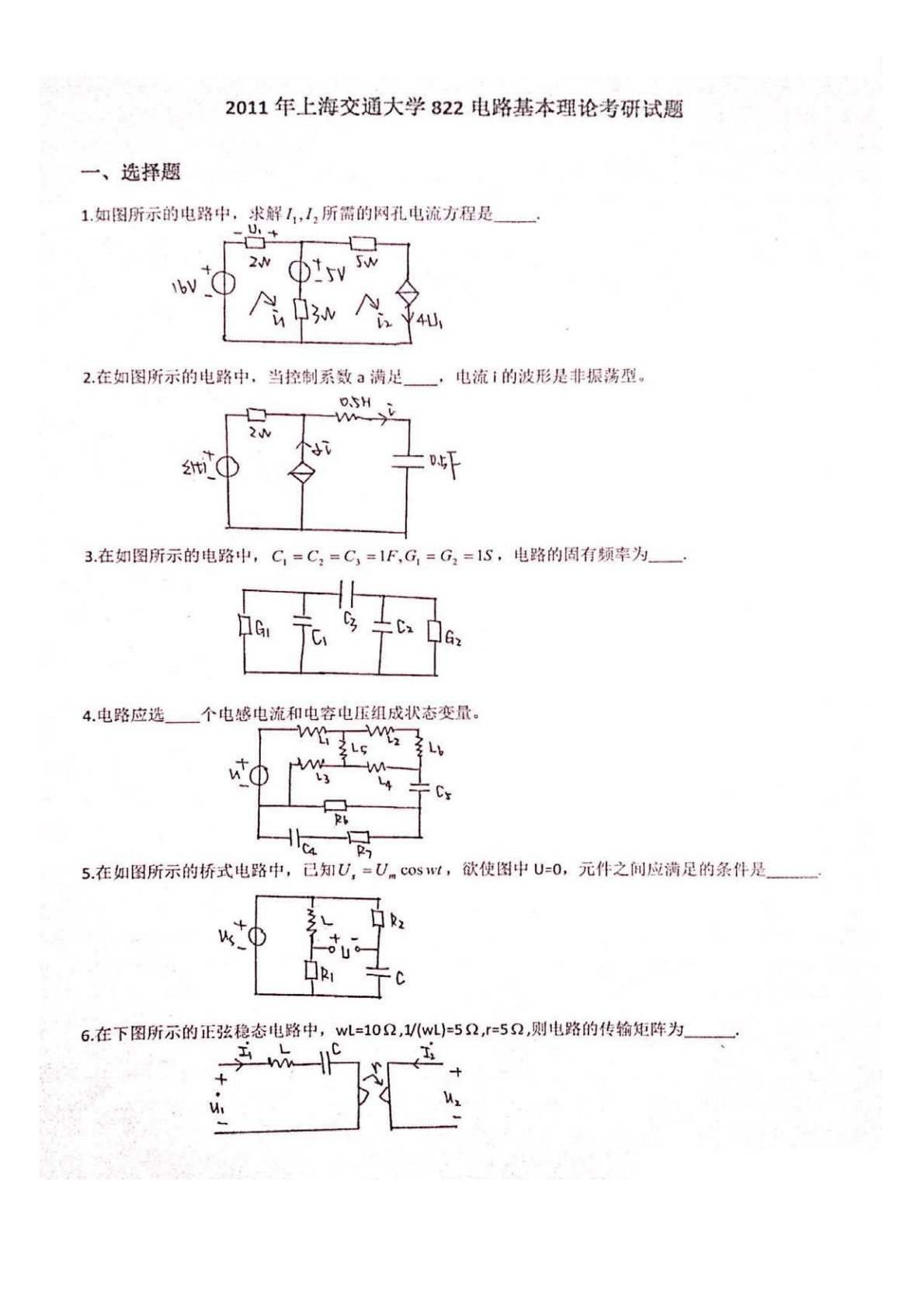 上海交通大学2011年822电路考研真题