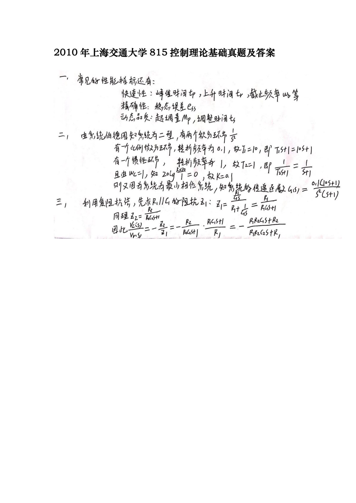 上海交通大学2010年815控制理论基础考研真题及答案解析