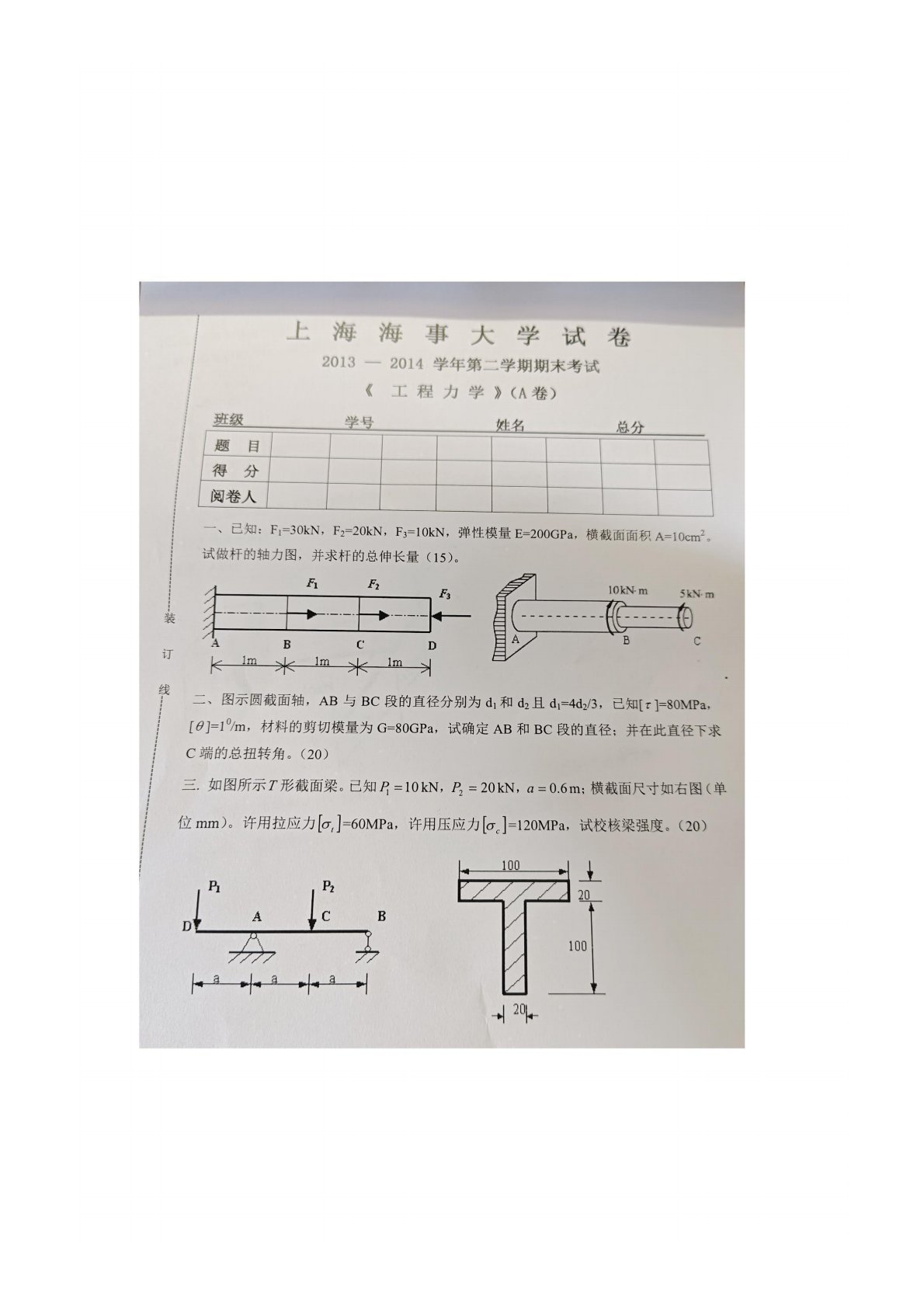 上海海事大学805工程力学2013-2014年期末试卷