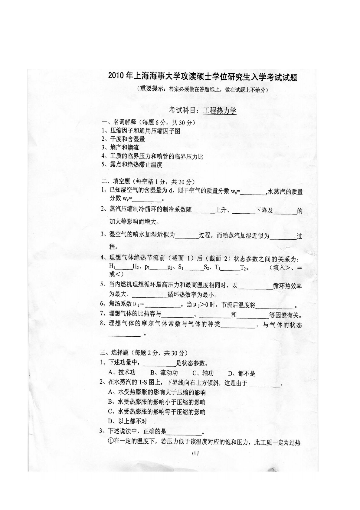上海海事大学803工程热力学2010年真题